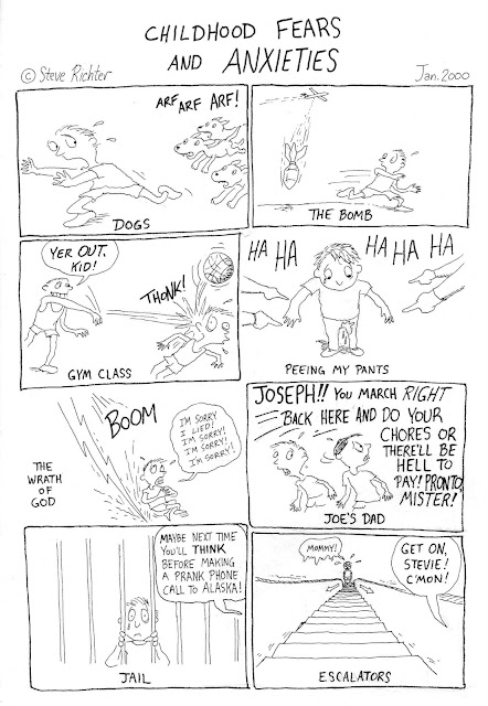 When I started drawing this, I realized I could go on and on, so I drew some of my adulthood fears and anxieties. I discovered they hadn’t changed all that much. Except the escalator fear. I’m over that. Now it’s elevators. And dogs. And the Bomb. and jail. and the wrath of God. etc.